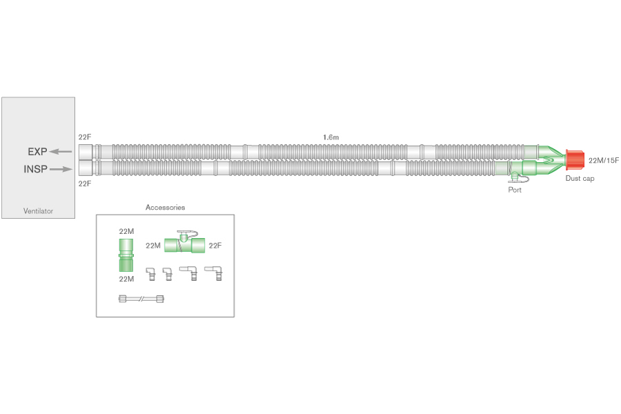 Дыхательный контур Flextube включает порт для подачи закиси азота и порт газоанализатора, которые находятся недалеко от Y-образного соединителя, для соединения с монитором. Порты люер лок и угловые соединители включены для присоединения устройства для контролируемой подачи закиси азота.