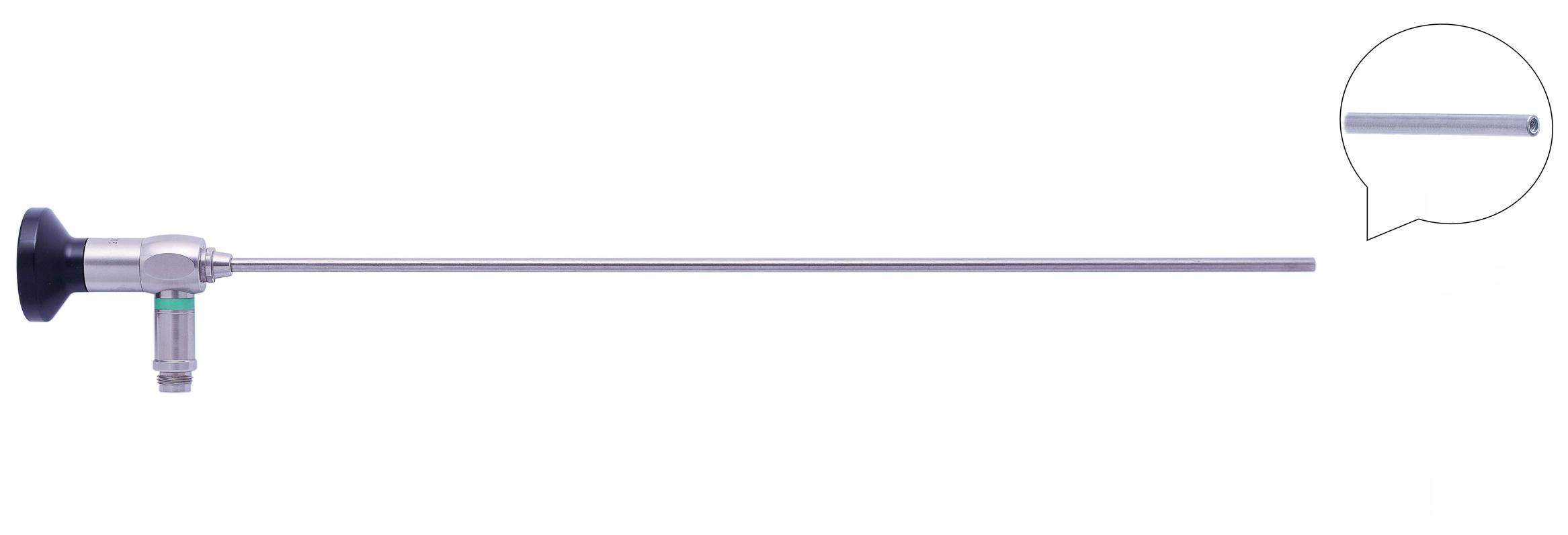 Диаметр рабочей части 3 мм ± 0,1, длина рабочей части 300 мм ± 10, угол направления зрения 0 градусов, входной угол поля зрения не менее 80 градусов, угол наклона световодного разъема к оси оптической трубки 90 градусов, сапфировое стекло на дистальном и проксимальном концах. Тип оптической схемы - стержнелинзовая. Корпус из нержавеющей стали. Цветовой код зеленый. Автоклавируемая 134°С; 2,3 бар. Встроенный стекловолоконный световод. Количество циклов стерилизации автоклавированием гарантированное производителем не менее 1000. Совместимость со световодами стандартов Шторц, Р. Вольф, Акми. Full HD совместимый. Совместимость с головками видеокамер стандарта «C-mount» и «J-lock». Антирефлексное внутреннее покрытие. Термический компенсатор длины.