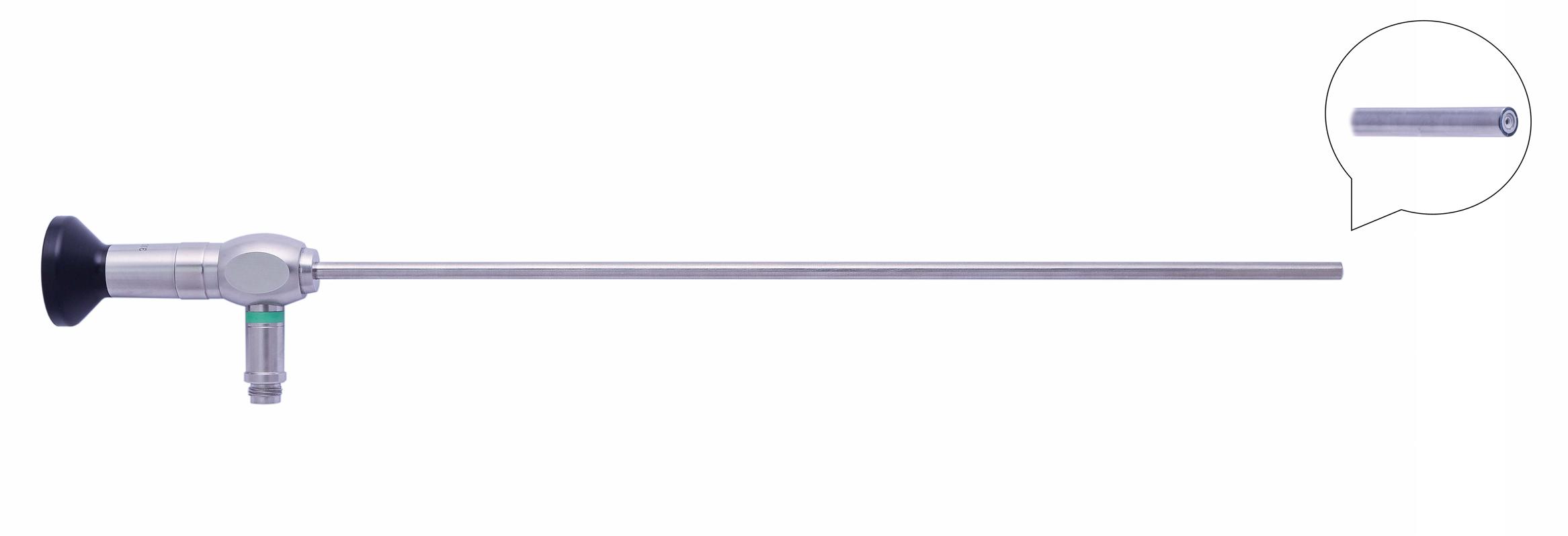 Диаметр рабочей части 5 мм ± 0,1, длина рабочей части 300 мм ± 10, угол направления зрения 0 градусов, входной угол поля зрения не менее 70 градусов, угол наклона световодного разъема к оси оптической трубки 90 градусов. Сапфировое стекло на дистальном и проксимальном концах. Тип оптической схемы - стержнелинзовая. Корпус из нержавеющей стали. Цветовой код зеленый. Автоклавируемая 134°С; 2,3 бар. Встроенный стекловолоконный световод. Количество циклов стерилизации автоклавированием гарантированное производителем не менее 1000. Совместимость со световодами стандартов Шторц, Р. Вольф, Акми. Full HD совместимый. Совместимость с головками видеокамер стандарта «C-mount» и «J-lock». Антирефлексное внутреннее покрытие. Термический компенсатор длины.