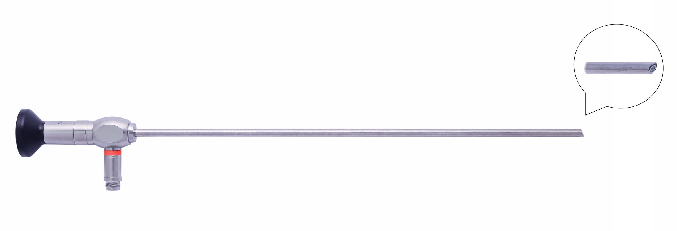 Диаметр рабочей части 5 мм ± 0,1, длина рабочей части 300 мм ± 10, угол направления зрения 30 градусов, входной угол поля зрения не менее 70 градусов, угол наклона световодного разъема к оси оптической трубки 90 градусов. Сапфировое стекло на дистальном и проксимальном концах. Тип оптической схемы - стержнелинзовая. Корпус из нержавеющей стали. Цветовой код красный. Автоклавируемая 134°С; 2,3 бар. Встроенный стекловолоконный световод. Количество циклов стерилизации автоклавированием гарантированное производителем не менее 1000. Совместимость со световодами стандартов Шторц, Р. Вольф, Акми. Full HD совместимый. Совместимость с головками видеокамер стандарта «C-mount» и «J-lock». Антирефлексное внутреннее покрытие. Термический компенсатор длины.